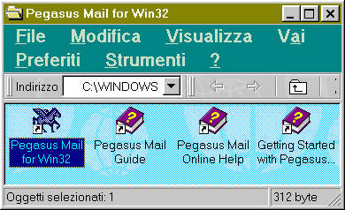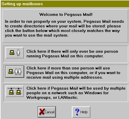 fa doppio click sull'icona (per aprire Pegasu Mail con Windows 95, premi il tasto Avvio, seleziona Programmi, Pegasus Mail for Win 32 ed ancora Pegasus Mail for Win 32) La prima volta che si avvia, Pegasus Mail aprirą la seguente finestra: